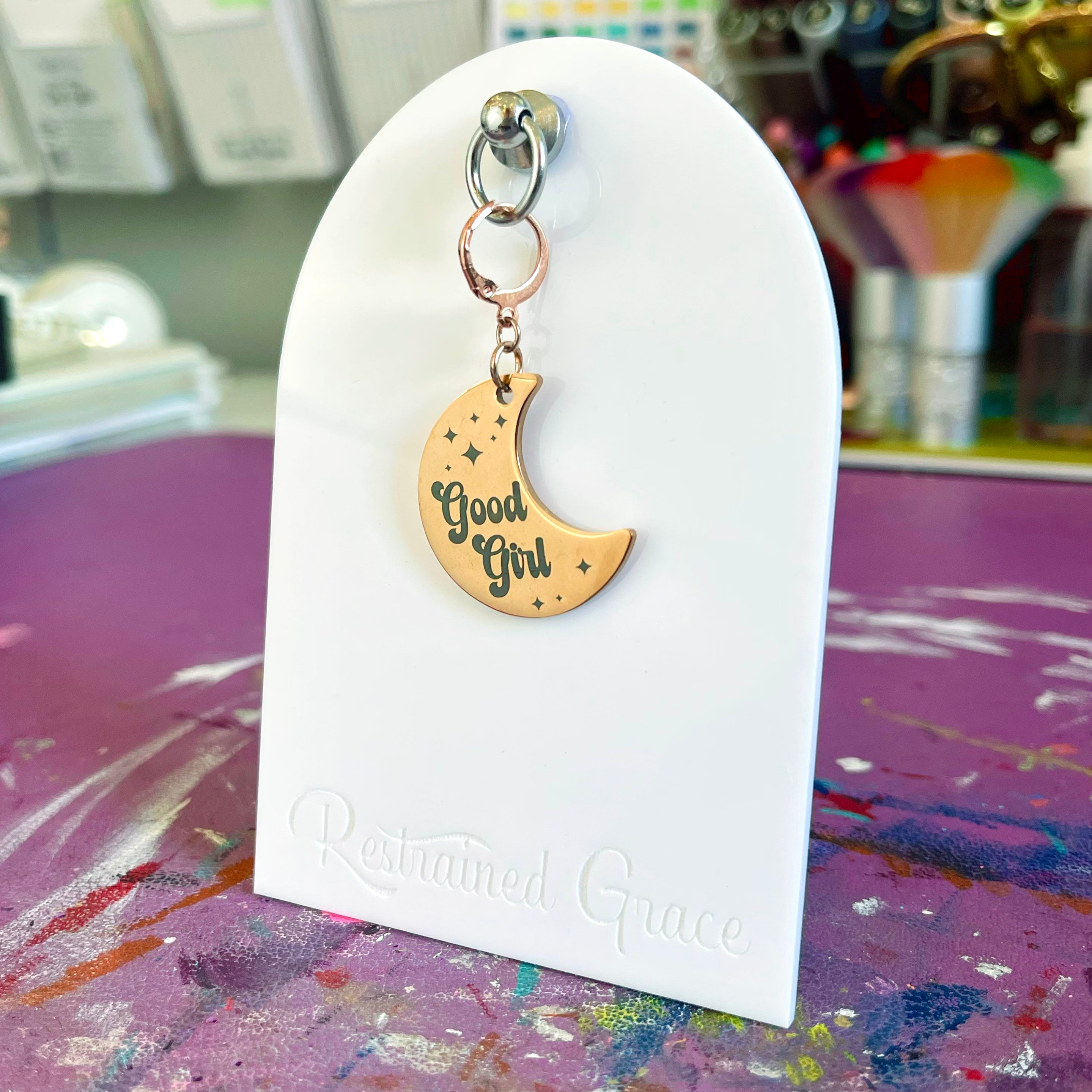 Is there a sweeter mark of ownership than a tag engraved with your pet name, or their title? This large steel crescent moon BDSM collar tag is our take on a classic. Choose silver, gold, rose gold, black, or rainbow to match your collar collection or daily jewelry.