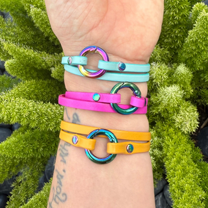This ultra discreet collar can double as a wrap bracelet! The front ring of O is also an ideal place to display any of our custom and colorful collar tags! Choose from yellow, fuchsia, or aqua leather. Each one is finished with our shiny iridescent rainbow hardware.