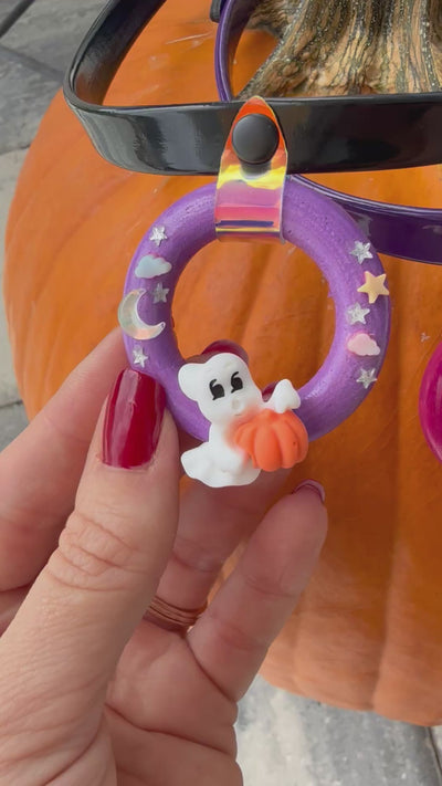 The sweetest little ghost and their pumpkin are enjoying a perfect Halloween night together. This 1.5” wooden ring of O is adorned with a ghastly vignette of resin charms and rhinestones. It is securely attached to a patent leather collar in your desired length. This collar is a wearable work of art, and as such is not suitable for leashes or tugging.